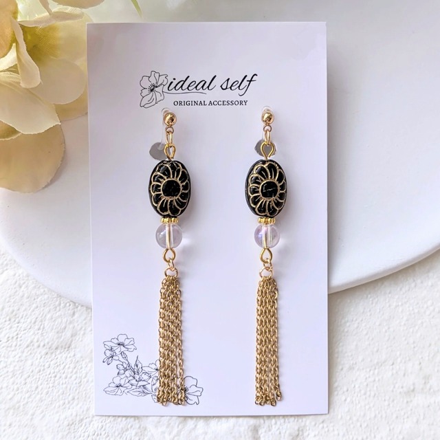 クラシカルな花模様のチェコオーバルフラワーと透明感が美しい天然水晶を組み合わせた、大人かわいいアクセサリーです。 光を受けるたびに、さりげなくきらめく水晶と 歩くたびにゆらゆら揺れるゴールドのフリンジが、お顔まわりをふんわりと華やかにみせてくれます✧*。 甘すぎず、少しレトロな雰囲気がきれいめなお洋服にも、カジュアルStyleにも相性◎ ■長さ・約6cm (フリンジ長さ・約3cm)