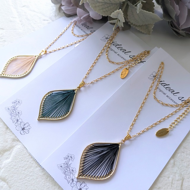 ふわっと軽やか。 糸で描いたアートみたいなネックレス 「糸霞 - いとかすみ」 しずく型のフレームに細い糸を 1本ずつ丁寧に張り巡らせ 凛とした美しさと柔らかな雰囲気が 魅力のデザインです。 シンプルなTシャツやワンピースに 合わせるだけで、ぐっとおしゃれに! デイリー使いはもちろん ちょっとしたお出かけや特別な日にも ぴったりです◎ 金属部分は肌にやさしいK16GP (16金コーティング)を使用。 大人っぽさと可愛さをどちらも楽しめる アクセサリーです✧*。 《サイズ》 ●チェーン長さ 50cm+アジャスター5cm ●ペンダントトップ 縦.約4cm × 横.約2.5cm 《カラー5色》 ●ブラック ●ボルドー ●ベージュ ●ブルーグレー ●ダークグリーン ❀――❁――❀――❁――❀――❁ ▼ダークグリーン ブラック・ベージュ画像はこちら https://idealself.base.ec/items/113001261