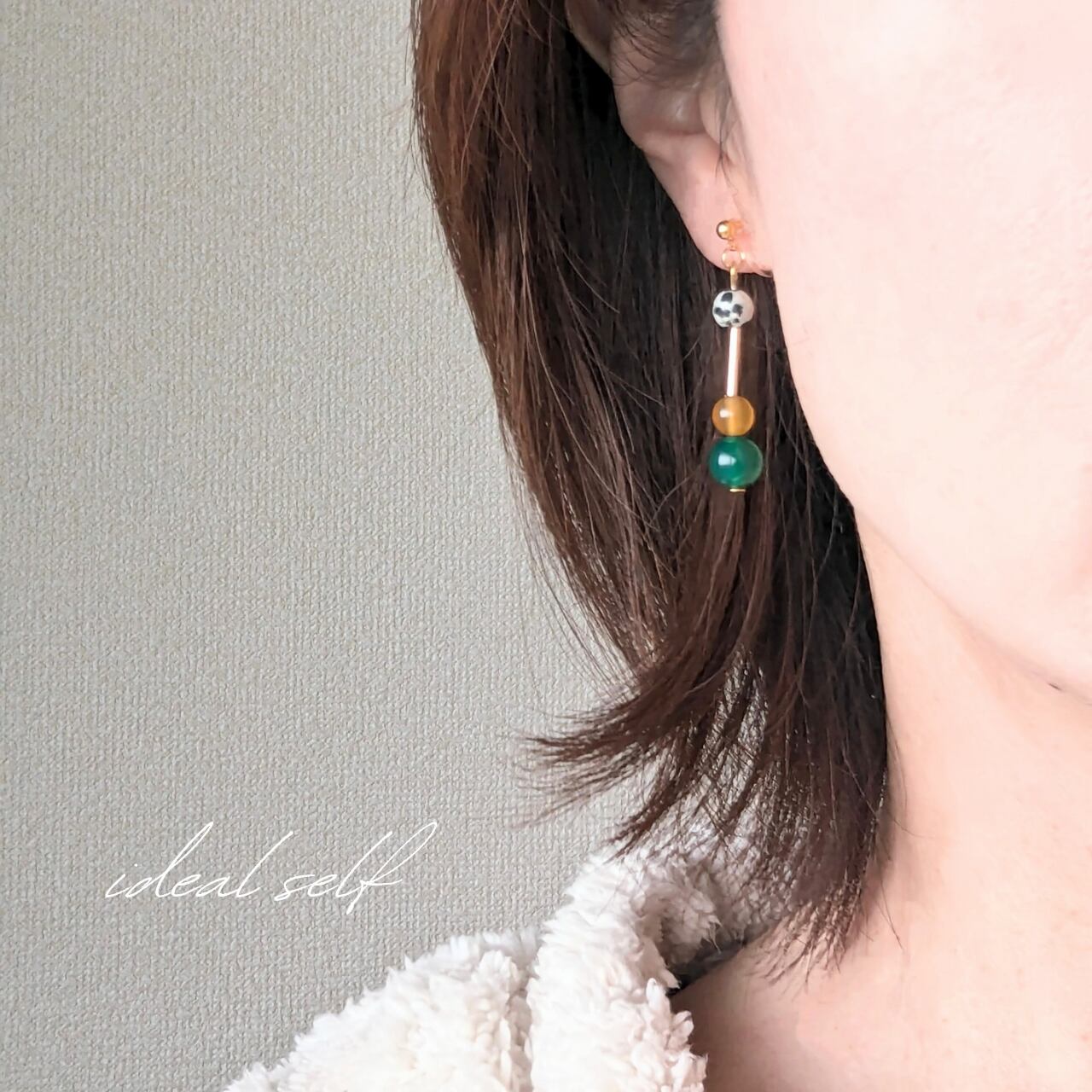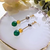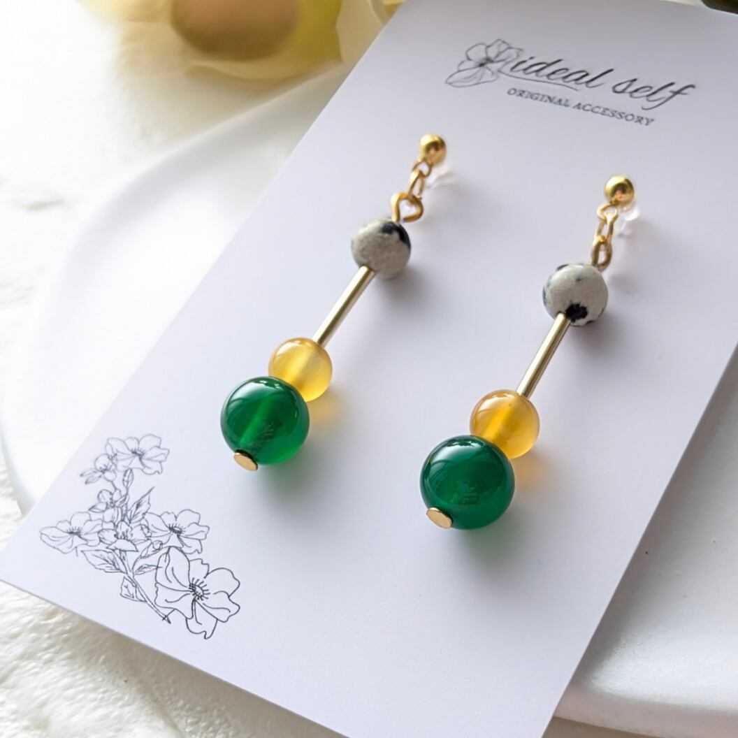 グリーンアゲート・イエローアゲート・ダルメシアンジャスパーの3種類の天然石を組み合わせた、彩り豊かなアクセサリー。